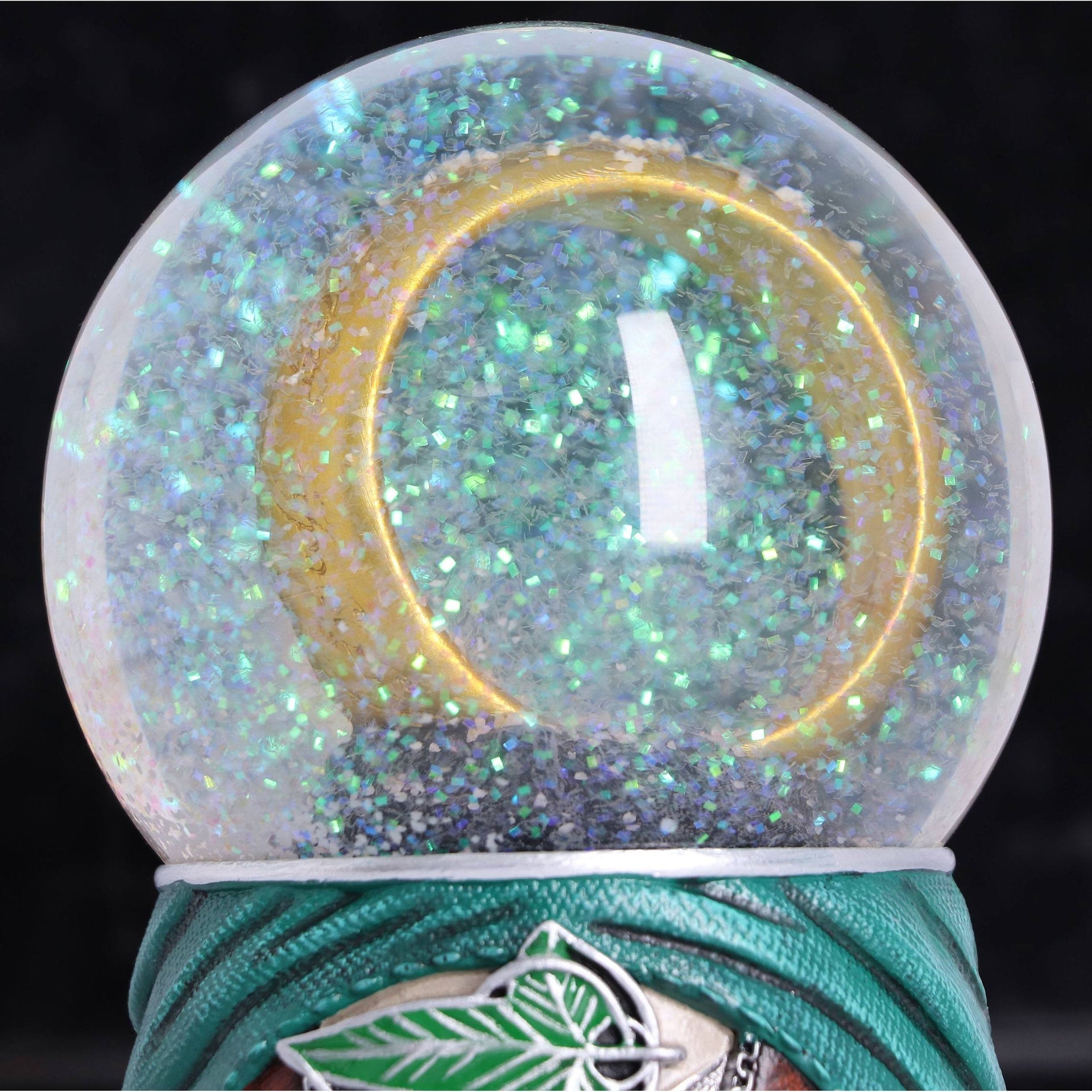 Die Basis dieser wunderschön gestalteten Schneekugel bilden Frodos grüner Umhang, die Vorderseite seines braunen Button-Down-Blazers und sein cremefarbenes Hemd. Das ikonische Lorien-Blatt befindet sich direkt unter der Oberkante und bildet den perfekten Mittelpunkt. Auf der Rückseite trägt es den Spruch „Selbst der kleinste Mensch kann den Lauf der Zukunft verändern.“ Im Inneren des Globus steht der Eine Ring im Mittelpunkt, umgeben von der Inschrift „One Ring to Them All“. Dieses exquisit gestaltete Stück wird aus feinstem Elfenharz gegossen und anschließend von Experten handbemalt.