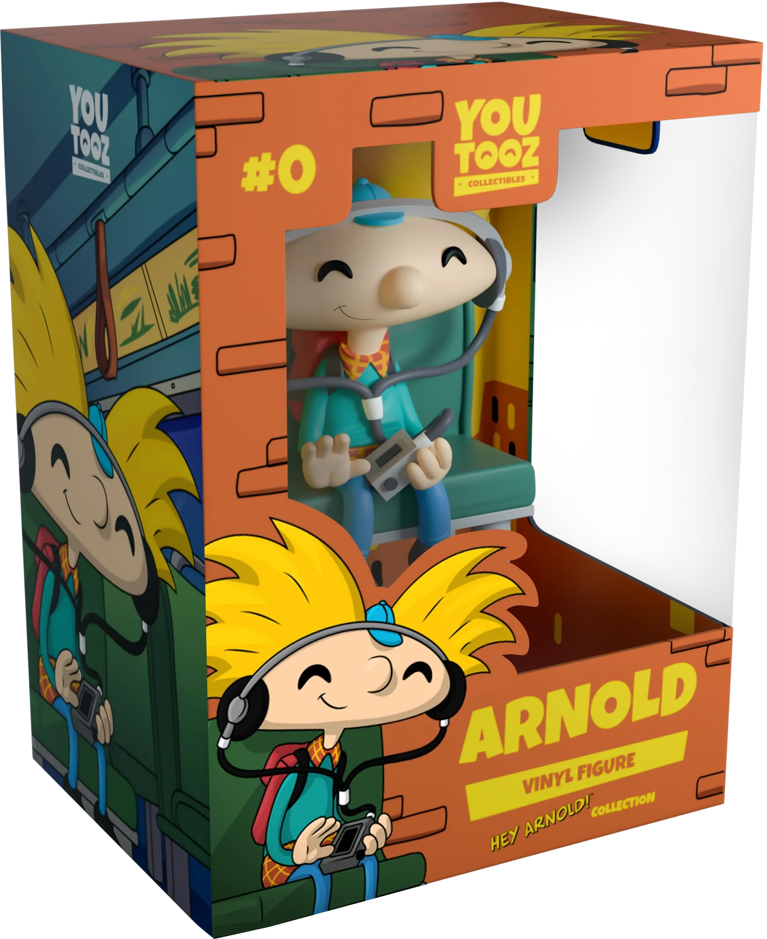 Hey! Arnold gibt sein Youtooz-Debüt! Er sitzt auf einem weichen grünen Bussitz und lauscht den sanftesten Melodien aus den grauen Kopfhörern auf seinem ovalen Kopf. Von seinen Ohren verlaufen graue Kabel zum Kassettenrekorder in seiner Hand, während die anderen die Melodie abtippen. Mit einem Lächeln auf der Seite seines Gesichts und einer blauen Mütze, die zwischen seinen charakteristischen gelben Haaren ruht, sitzt ein grüner Pullover auf seinem langen karierten Hemd, während enge blaue Hosen bis zu großen schwarzen Schuhen reichen. Das Äußere der Verpackung zeigt einen leuchtend blauen Bus, der von einer Straßenlaterne beleuchtet wird, während er durch eine Stadtstraße fährt, während das Innere eine orangefarbene Skyline vor einem warmen Sonnenuntergang zeigt. Das Coverbild ist eine leuchtend rote Backsteinmauer, da die schwarzen Silhouetten der Figur durch die farbigen Fenster sichtbar sind. Dieses Sammlerstück wird in einer geprägten, schützenden, matten Außenhülle und einer maßgefertigten Kunststoffschutzhülle für maximalen Schutz während des Versands geliefert.