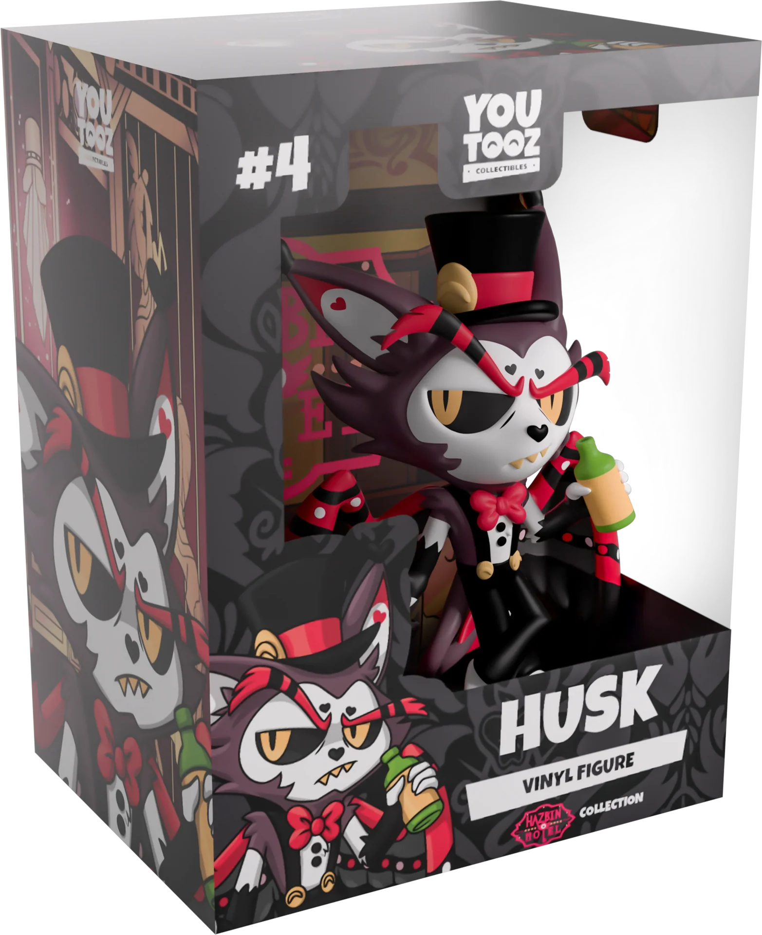 Need a drinking buddy? Well, Husk has landed at Youtooz to be the best friend imaginable while you drink your sorrows away! Standing at 4.6 inches tall, he holds a bottle in his left hand and casts a disgruntled sideways glance with pale yellow eyes beneath long striped eyebrows, his pointed ears tipped with small black hearts and sits on either side of a black top hat. With his red, black and white wings spread as he leans on a folded umbrella, he wears a red bow tie and suspenders while a long fan-shaped tail curls around his back. The outside of his packaging is covered in an ornate gold wall border against a dark red background, while the inside sees him standing at his bar taking a huge swig from a bottle. The protective sleeve then shows the city skyline with a deep red light shining from the buildings as its silhouette can be seen through the large clear window on the front of the package. This collectible comes in a protective, embossed, matte outer sleeve and a custom-sized plastic protector for maximum protection during shipping.