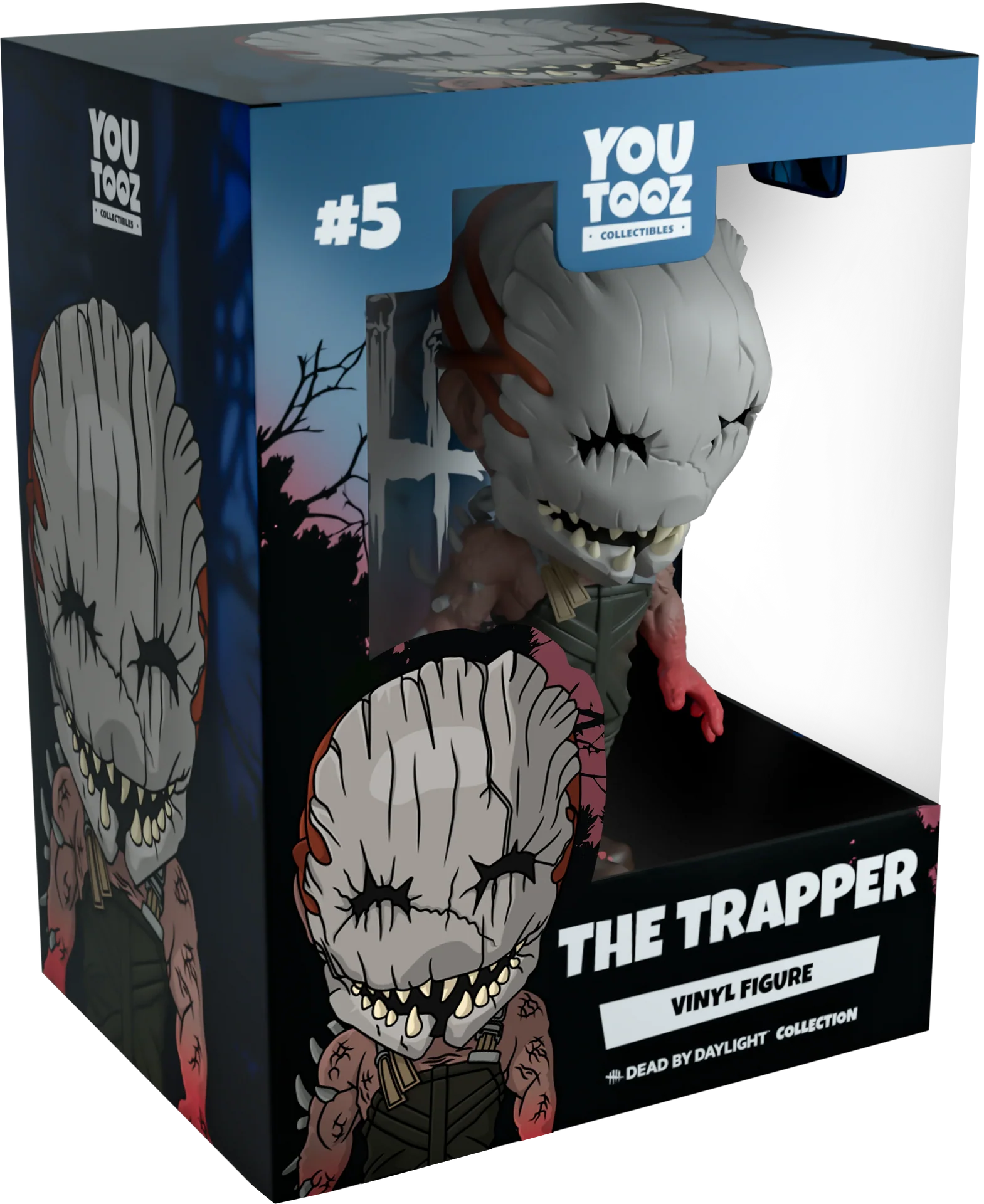 The Trapper has made his way into Youtooz to set the perfect trap for his debut! Standing 4.6 inches tall and wearing a terrifying cracked mask with two rows of razor-sharp teeth and a split lower jaw haphazardly attached to his head, his mutilated and cracked flesh is pierced by metal hooks protruding from his right arm. Leaving a large pool of blood dripping from the gruesome cleaver clenched in his reddened fist, he wears dark green overalls and low brown boots. The outside of his packaging shows the Trapper holding Dwight by the neck and lifting him off the ground as he prepares to deliver the final blow. While the inside is a black silhouetted forest with glowing red and blue mist and the white "Dead by Daylight" logo on the back, this sinister design is then continued on the protective sleeve with dark trees completely surrounding him while his silhouette can be seen through the large clear window on the front. This collectible comes in a protective matte, embossed outer sleeve and a custom-sized plastic protector for maximum protection during shipping.