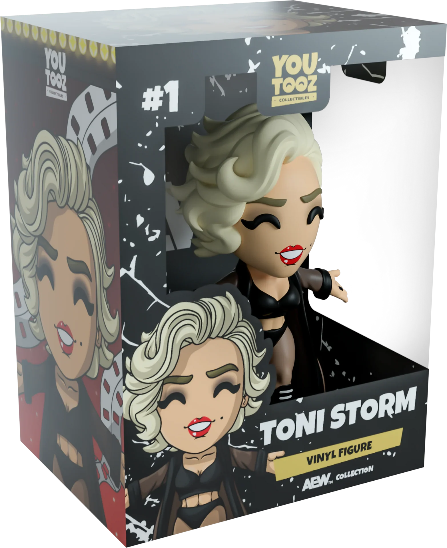 Do you think you could handle the Storm Zero? Toni Storm stands magnificently, yet dangerously, at 4.5 inches tall and wears a two-piece black wrestling outfit with black lace-up boots, while a long brown dress finished with black trim falls from her shoulders. With her arms outstretched to the sides showing black rings on both hands, framing her beautiful face is a fluffy platinum blonde tousled bob as a bright smile shines from her glossy red lips. The glass display case shows Toni descending the steps ready to enter the ring, while spotlights keep her well-lit. While the interior has been designed with a sporadic white speckled pattern on a black background that continues onto the protective sleeve as her silhouette is visible through the large clear window located at the front. This collectible was designed in collaboration with community member @therealracckun and comes in an embossed matte protective outer sleeve and a custom-sized plastic protector for maximum protection during shipping.