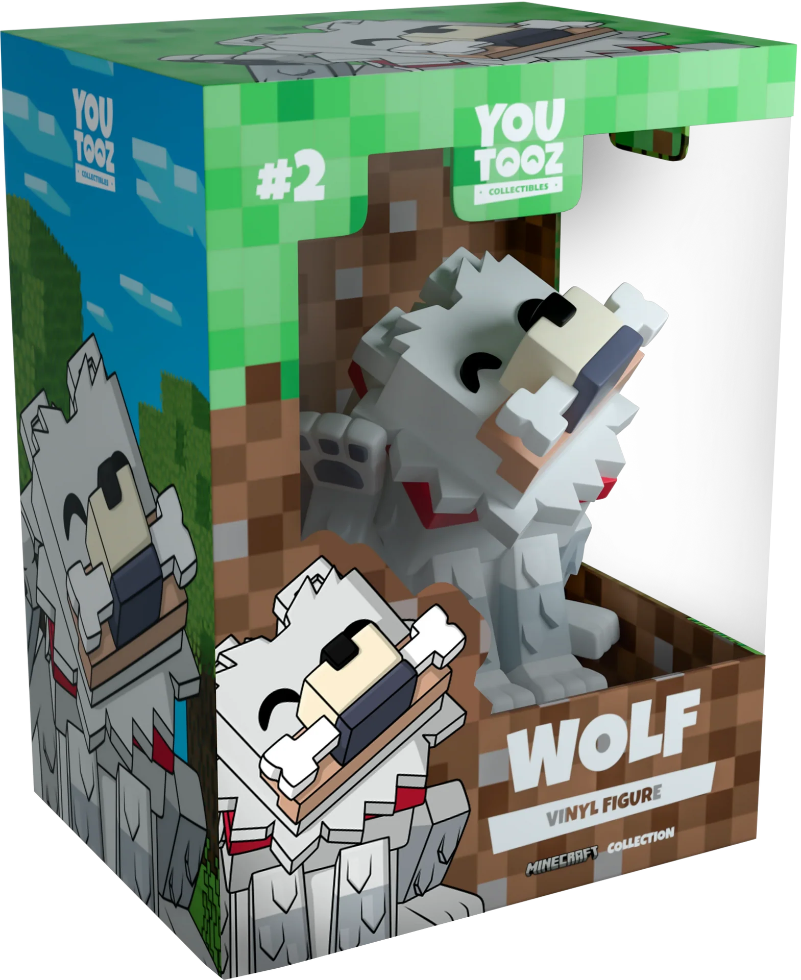 Sitting at 10cm tall with one playful hind leg raised to scratch its tilted head that looks upwards, they triumphantly hold a shiny white bone in their mouth. A perfect grey mane surrounds their head and matches their pointed ears while a bright red collar encircles their neck and a long tail curls around their side. The outside of their packaging shows the wolf sitting among the tall trees of a wooded forest while two small bear cubs play happily. While The interior surrounds them with first brown blocks, which continue onto the protective sleeve while their silhouette can be seen through the large transparent window on the front of the packaging. This collectible comes in an outer sleeve matte, embossed protector and a custom-sized plastic protector for maximum protection during shipping.