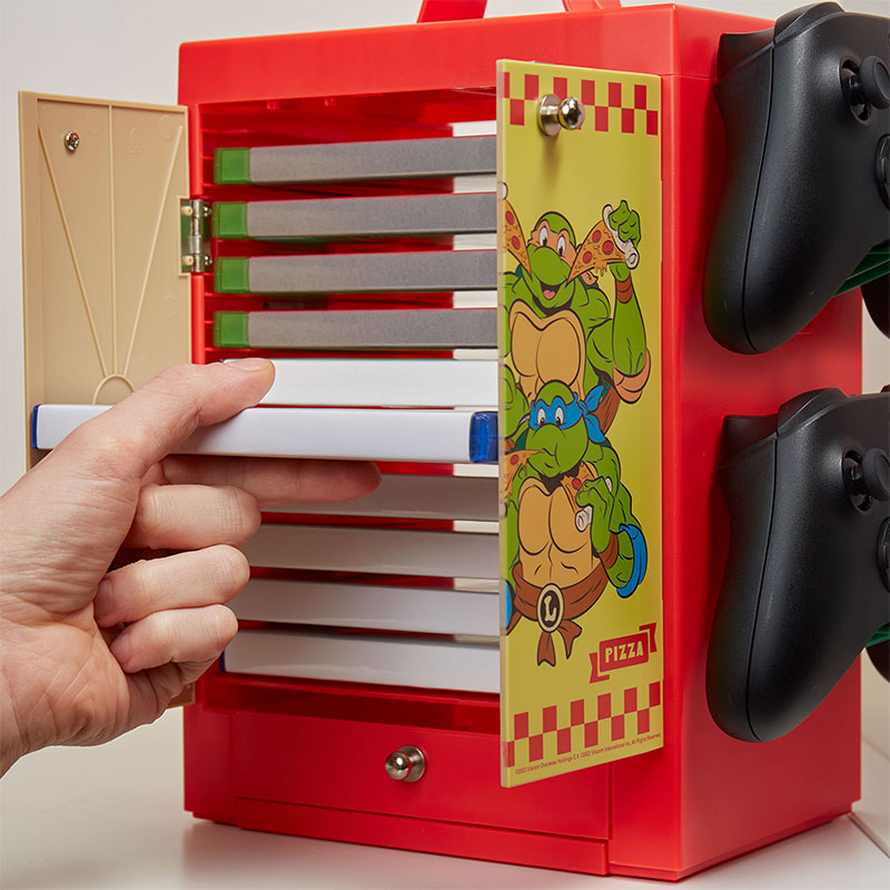 Gardez votre espace de jeu propre et bien rangé afin que vous ayez de la place pour votre pizza avec ce casier de jeu Teenage Mutant Ninja Turtles. Conçu avec un support sur le dessus pour vos écouteurs, il peut contenir jusqu'à 10 jeux Xbox One/Xbox Series X|S, jeux PS4/PS5 ou films et il y a un tiroir pratique pour d'autres éléments essentiels.