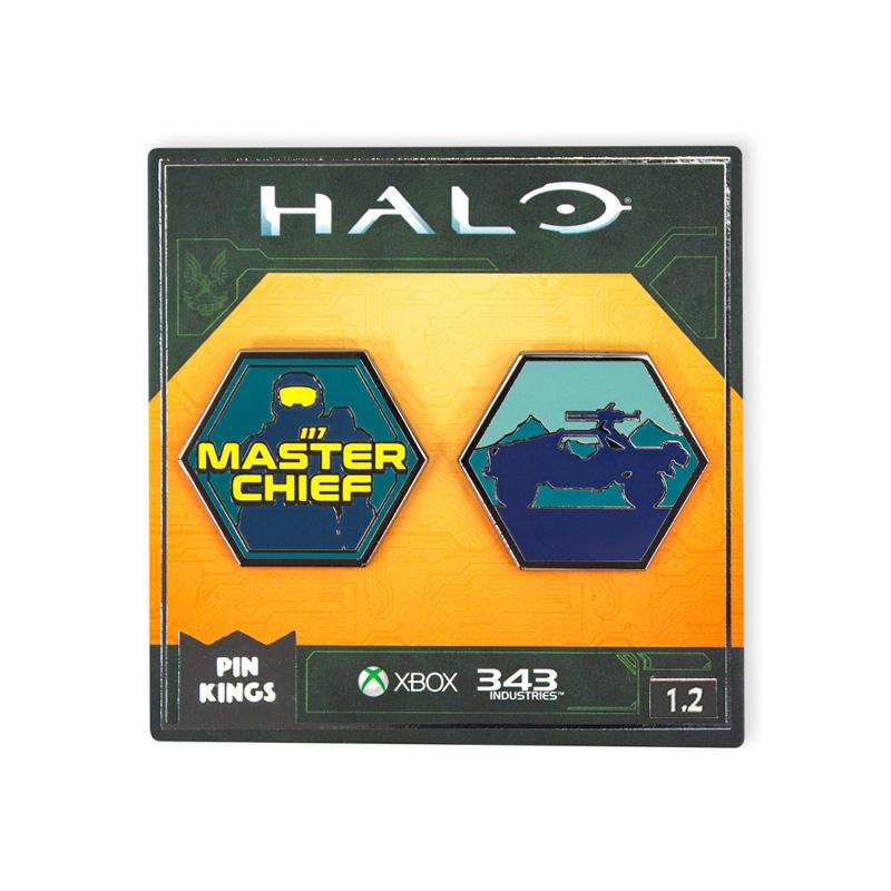 - Deux broches en métal émaillé dur de qualité supérieure avec une finition brillante avec des motifs Master Chief et Warthog sur une carte de support.